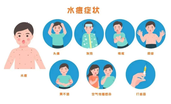 主要通过空气飞沫和直接接触进行传播,起初类似于感冒如发烧、头痛、喉咙痛等,以发热、皮肤和黏膜成批出现周身性红色斑丘疹、疱疹、痂疹为特征,皮疹呈向心性分布,主要发生在胸、腹、背,四肢很少,传染力极强。感染后需隔离与治疗,隔离至全身皮疹结痂为止,时间一般不少于发病后两周。