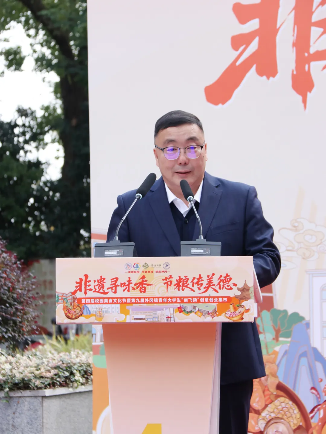 在热烈的气氛中,外冈镇副镇长王磊、学校常务副校长王中强等领导共同启动了本届美食文化节与创意创业集市。随着五谷倾泻而入,象征着硕果的谷物汇聚成塔,以一场极具仪式感的“光盘宣言”,点亮了活动的璀璨序幕。